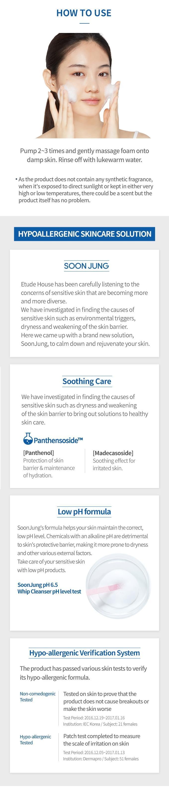 Gentle, soothing cleanser for sensitive and irritated skin. [Etude House] SoonJung pH 6.5 Whip Cleanser creates a soft, creamy lather that cleanses without stripping moisture. Formulated with Panthenol and Madecassoside, it calms redness, strengthens the skin barrier, and protects against daily irritants. Perfect for daily use, leaving skin soft, hydrated, and balanced.